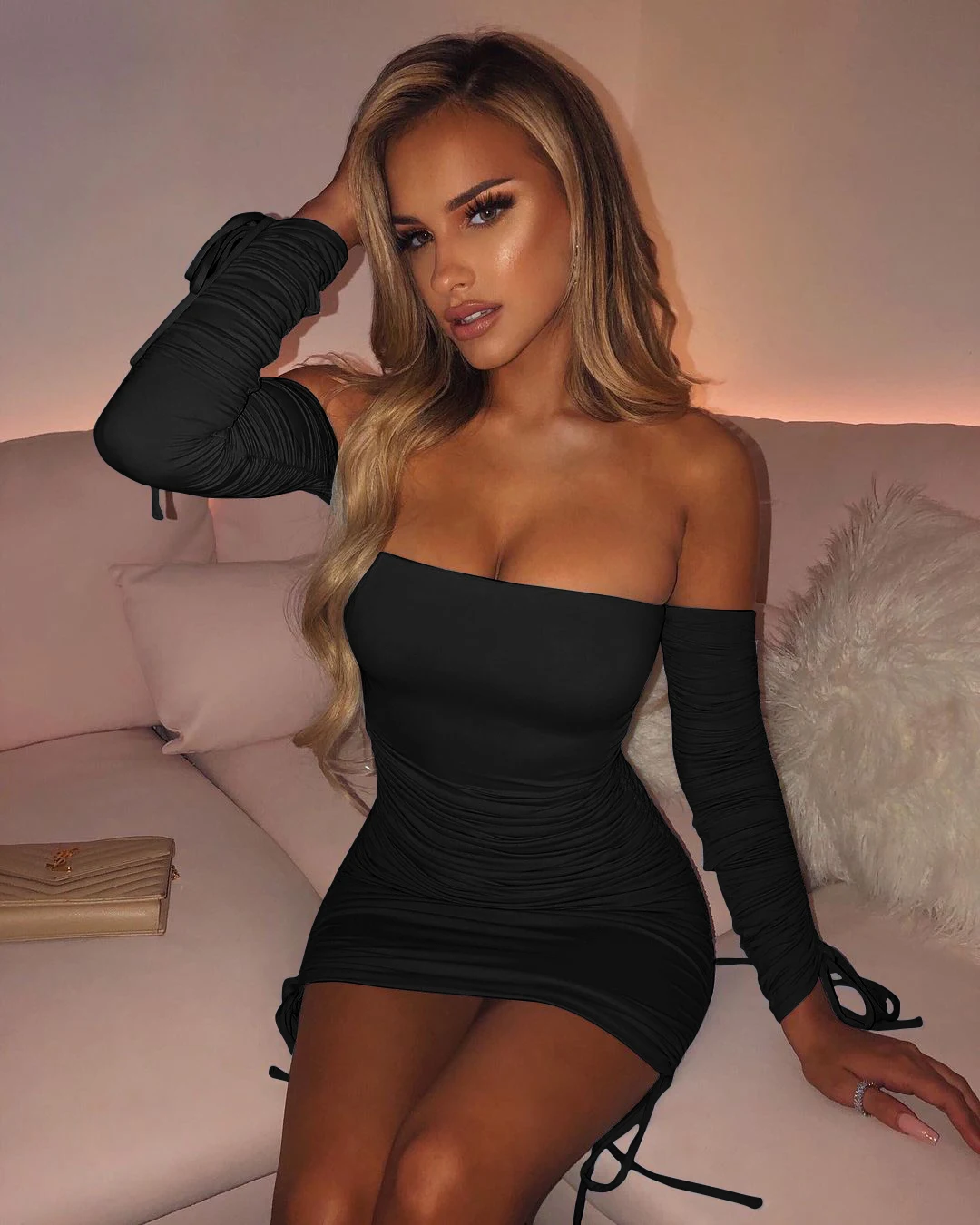 Fashion Design Club Dress off Shoulder Ruched Long Sleeve Woman Sexy Bodycon Mini Party Dress